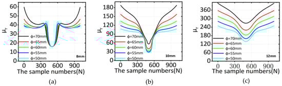 As shown in Figure 8, the baseline value of the curve decreases as the external diameter of the steel pipe increases, and the concave feature of the signal becomes weaker. For the steel pipes with the same outer radius, the larger the internal diameter of the pipe, the more significant the differences in the MPP of the defect.