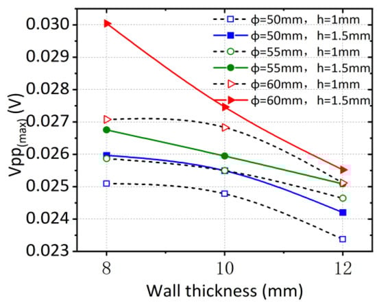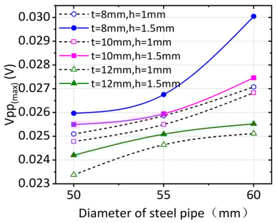 The curve of signal amplitude versus wall thickness was redrawn as shown in Figure 10. The signal decreases with the increase in wall thickness under the condition of the same external diameter. In the process of increasing the wall thickness from 10 mm to 12 mm, the decrease degrees of the signal of the φ50 mm and φ55 mm steel pipes are smaller than that of the φ60 mm steel pipes. This indicates that the amplitude of the MPPT signal of the axial internal wall crack is more affected by wall thickness for the steel pipes with a larger diameter.
