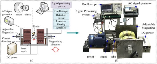 The MPPT system for the small-diameter thick-walled steel pipes. (a) is a diagram of the experimental platform model. (b) shows the experimental platform.