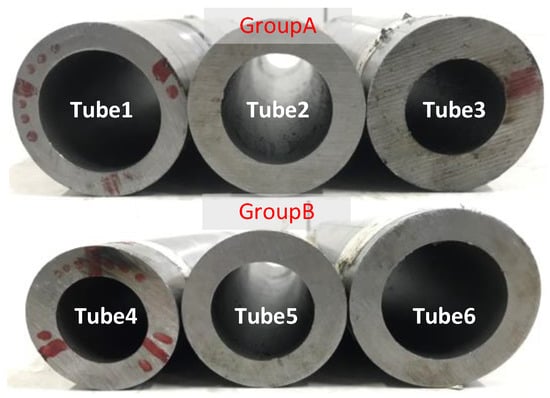 Six experimental sample pipes were used in the experiments, as shown in Figure 12. The axially scored grooves were scored using EDM. The crack length and width dimensions are 20 mm × 1 mm, and the depths are 0.5 mm, 1 mm, and 1.5 mm respectively.