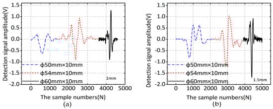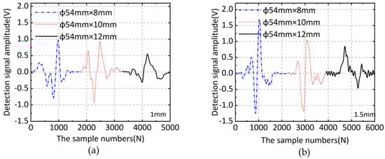 Figure 13b shows the experimentally derived signals of the axial cracks in the steel pipes of different wall thicknesses. The results show that obvious detection signals can be obtained for defects at a depth of 1.5 mm in the internal walls of the three types of pipes, but the signal amplitude of the steel pipe with the smallest wall thickness is the largest.