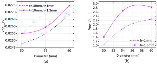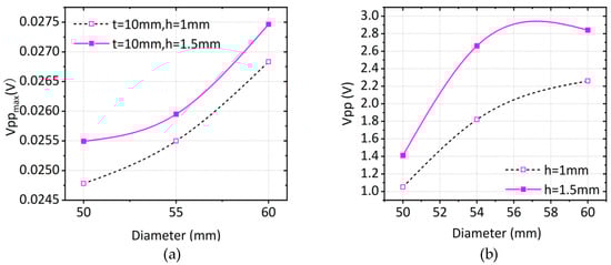 Experiments were conducted on Group B, consisting of steel pipes with the same external diameters and different wall thicknesses, to verify the effect of the internal diameter of a pipe on the MPPT signal. The signals of axial cracks in the internal walls of the pipes of different sizes are shown in Figure 15. Their peak-to-peak values were extracted, and the obtained fitted curves are shown in Figure 16.