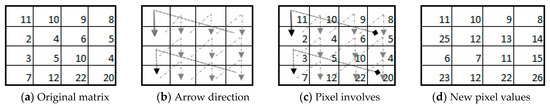 Step 4: In this step, the manipulation is performed separately on each block, . If represents any column to be selected from a square matrix , where , then denotes the selection of a specific column in the matrix . The summation of two-pixel values from different columns and two adjacent pairwise rows is performed to derive a new value, as shown in Figure 4a–d, when Equation (6) is applied. For blocks , the value of is 1, whereas for blocks , the value of is 123. The process of summation is dependent on the number of iteration processes in each block, which can range from 1 to 4. However, for this study, only three iterations were conducted to increase performance. The top row remains unchanged, which simplifies the decryption process. The pseudo code algorithm of this process is shown in Algorithm 2.
