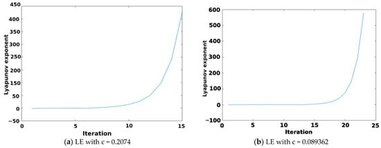 When Equation (17) is used with different values of C from the triangular membership function, it forms different bifurcation diagrams, as seen Figure 8. The Lyapunov diagram is shown in Figure 9. Figure 10 shows both the bifurcation diagram and its Lyapunov exponent of the hybrid of logistic sine map as used in Equation (11).