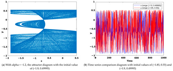 In Equation (11), we have set the unknown parameter alpha to a value of −1.2 and selected (−1.9, 0.49995) as the initial value. Figure 11a presents the chaotic attractor diagram of the system. To examine the system’s sensitivity to the initial value, we have compared the sequence diagrams with two different initial values: (−1.85, 0.55) and (−1.9, 0.49995). Figure 11b illustrates how minor changes in initial values affect the dynamic behavior of the system defined in (11). The chaotic properties of the system have significantly altered, which implies that the system is highly dependent on the initial value.