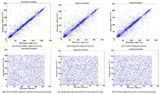 The statistical method used to assess the magnitude and direction of the relationship between two variables is referred to as the correlation through bivariate analysis. The correlation coefficient value ranges between −1 and +1 and indicates the strength of the association between the two variables. When the correlation coefficient approaches 0, it signifies a weaker relationship between the variables. A positive (+) sign indicates a positive relationship, while a negative (−) sign indicates a negative relationship. An effective image encryption scheme should produce a randomly distributed output with minimal correlation between adjacent pixels. Typically, the correlation of pixels in both plain and cipher images is evaluated in the horizontal, vertical, and diagonal directions. The correlation coefficient between the adjacent pixels is defined and measured in Equation (20):