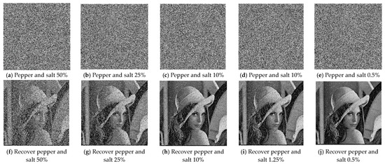 Noise (pepper and salt) effect on ciphertext and recovery image in different degrees.