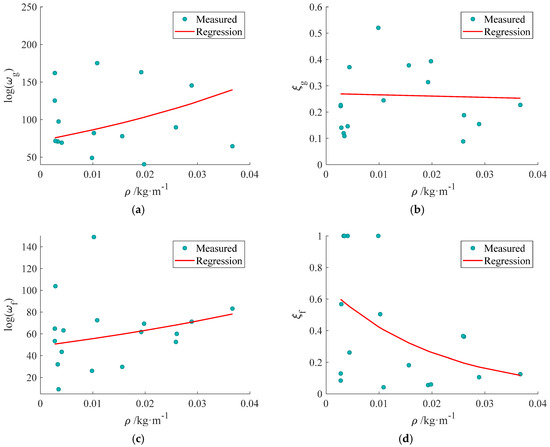 The fitting results of EPSD parameters with scaled charge quantity: (a) regression result of ; (b) regression result of ; (c) regression result of ; (d) regression result of ; (e) regression result of c; (f) regression result of d; (g) regression result of PGA.