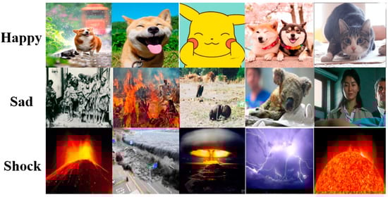 In the experiment, video signals were used to determine static images and dynamic images that could elicit three types of emotions: happiness, sadness, and shock. Figure 1 shows the dataset used to induce three emotions with rows of “happy,” “sad,” and “shocking” pictures. Each emotion category consists of four static images and one dynamic image, resulting in a total of 15 different video signals. The experiment also employed nine LFS signals, previously shown to modulate the intensity of happiness, sadness, and shock to varying degrees. Previous experimental studies have found that LFS composed of different frequency components can enhance the level of arousal, which can make people feel influenced and dominated by the signal and cause a more pronounced, intense sense of annoyance, space, and immersion and can alter subjective emotional perception. Then, a subjective evaluation experiment was conducted based on the evaluation dimensions (annoyance sense, space sense, immersion sense), in which the participants were asked to watch happy, sad, and shocking movie clips without the addition of LFS, and it was found that the change in annoyance correlated most with the level of happiness, the change in space sense correlated most with the level of shock, and the change in immersion sense correlated most with the level of sadness in the movie. Finally, adding LFS to the movie clips revealed that S1–S3 signals most enhanced the primal sense of annoyance, S4–S6 signals most enhanced the primal sense of immersion, and S7–S9 signals most enhanced the primal sense of space. Thus, we concluded that S1–S3 had the effect of modulating happiness, S4–S6 had the effect of modulating sadness, and S7–S9 had the effect of modulating shock.