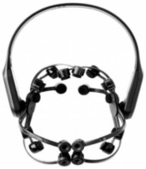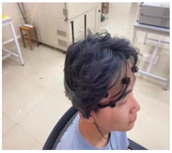 The composition of subjects, the equipment used for audiovisual signal presentation, and the experimental setting were identical to those in the subjective evaluation experiment. The EMOTIV EEG device, as illustrated in Figure 2, is utilized for recording the brain wave signals. Figure 3 illustrates the proper placement of the EEG device on the subject’s scalp, with electrode positions AF3, AF4, F3, and F4 based on the Brodmann functional brain regions known to process emotion stimuli []. The video signals and LFS signals used in the experiment remained the same as those in the subjective evaluation experiment in the same order. The duration of the video and audiovisual signals was adjusted to 10 s, with a 5 s interval between them, and a 15 s interval between each type of emotion, during which gray pictures were displayed without accompanying sound. Subjects were instructed to maintain a relaxed state, minimize blinking and swallowing, and avoid head movement during the signal presentation. Initially, a 15 s baseline reference state was recorded without any visual or auditory stimulation. Subsequently, brain wave signals were recorded during the presentation of video signals depicting happy, sad, and shocked emotions without audio stimulation, and then, with the addition of LFS stimulation, following the experimental conditions in order.