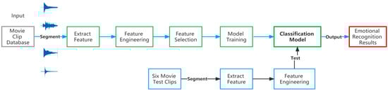 Based on subjective evaluation experiments and EEG measurement experiments, it was demonstrated that LFS had a significant influence and modulation of known happiness, sadness, and shock, a suppressive effect on happiness in audiovisual scenarios, and that it could enhance sadness and, to varying degrees, shock. The simulation experiments indicated that bass has a consistent effect on enhancing shock. The bass component is the main source of shock in the viewing environment, with a richer database of shock scenes in actual 5.1 sound format films. Therefore, in this section, a classification algorithm for emotion scene classification based on mono-channel SW signals is proposed by processing and analyzing movie clips in 5.1 audio format. The feasibility of using eigenvalues extracted from the SW signal (i.e., the 0.1 channel in the 5.1 audio) for binary classification of shock and other emotion types is verified through training of the classification model, and the most suitable classification model is determined, along with the specific algorithm process and selected eigenvalues. The experimental flowchart is shown in Figure 4, with specific experimental steps as follows.