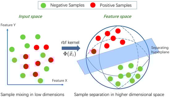 - SVM is a classical binary classification supervised learning algorithm known for its good robustness. The main objective of this algorithm is to find the optimal separating hyperplane that correctly classifies different types of data points [,], as illustrated in Figure 5.
