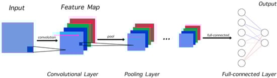 - CNN models can be used not only in image recognition but also in emotion recognition from audio signals []. The network structure of a CNN classification model consists of four parts: input layer, convolutional layer, pooling layer, and fully connected layer. The model is trained iteratively using the backpropagation algorithm, as shown in Figure 7 illustrating the CNN model network structure. The convolutional layer, with its characteristics of local connectivity and weight sharing, simulates simple cells with local receptive fields and extracts primary visual features []. This reduces the number of connections in the network significantly. The pooling layer, also known as the subsampling layer, simulates complex cells by filtering and combining the primary visual features into higher-level, abstract visual features, thereby reducing the number of parameters. The fully connected layer maps the learned “distributed feature representation” to the sample label space, enhancing the nonlinear capability of the network and limiting the size of the network [].