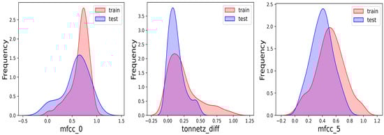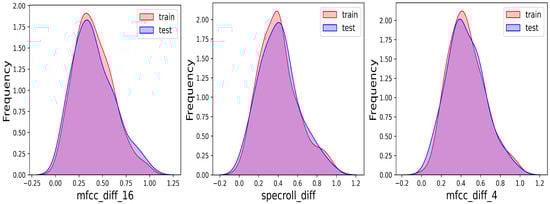 - Homoscedastic screening by means of KDE plots. KDE plots are used to infer the distribution of population data based on a limited sample. The result of kernel density estimation is the estimated probability density function of the samples, and based on this result, the clustering areas of data can be obtained []. KDE is a nonparametric estimation that does not incorporate any prior knowledge, but fits the distribution based on the characteristics and properties of the dataset itself, and thus obtains a more optimized model than parametric estimation methods []. In this experiment, the differences in data distribution between eigenvalues in the training set and the test set are evaluated by drawing kernel density estimation plots of the dataset distribution. If the overlap of the kernel density estimation plots is high, it indicates that the data distribution differences are small, and the feature is retained []; otherwise, it is removed. Figure 8 presents eigenvalues with small data distribution differences, while Figure 9 presents eigenvalues with large data distribution differences.