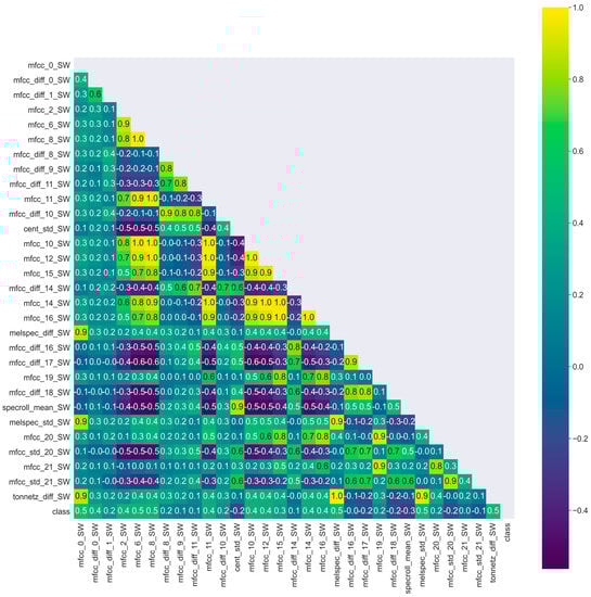 - Correlation screening by means of correlation heat maps. By analyzing the correlation between two or more variables, the closeness of the correlation can be measured. Figure 10 shows the correlation heat map of SW mono eigenvalues with labels under 9 s window length segmentation. In this experiment, the Spearman rank correlation coefficient is used to analyze the data, which is a nonparametric measure of rank correlation. The mathematical formula for calculating the Spearman rank correlation coefficient is as follows: