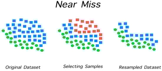 After the feature parameter selection process, the near-miss undersampling technique was applied to the dataset to balance the distribution of class categories. Near-miss is an undersampling technique that aims to balance class distribution by randomly removing majority class data [,], as illustrated in Figure 11. Since the duration of each movie clip in the movie scene clip database is not uniform, the category distribution of the training data will be skewed. The data imbalance problem will cause significant interference to the learning of the algorithm. In schematic 10, if the blue squares represent category 1 and the green circles represent category 2, it is obvious that the data samples of category 1 are larger than the data samples of category 2, and the near-miss algorithm will eliminate the excess. The near-miss algorithm eliminates the redundant category 1 samples (red squares) to achieve the purpose of balancing the category 1 and category 2 data distribution categories. Therefore, in this experiment, after completing the feature parameter selection, near-miss undersampling was applied to balance the class distribution by removing the majority class data [,], which in this case corresponds to the positive class or the “shock” emotion clips from the dataset.