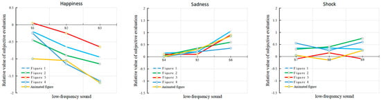 The subjective evaluation scores of video stimuli without audio were used as reference values for each participant, and the subjective evaluation scores of the same visual stimuli with the addition of different LFS signals were considered outcome values. The relative values of subjective emotion evaluation were obtained by subtracting the reference values from the outcome values, which indicated the enhancement or reduction in perceived emotion intensity for each participant under the three emotion states caused by the different LFS signals. A positive relative value indicated that the addition of LFS signals increased the perceived intensity of the known emotion. A negative relative value indicated a trend of reduced intensity in the perceived emotion due to the addition of the corresponding LFS signal. A relative value of zero indicated no effect of the LFS on the perceived emotion intensity. As is shown in Figure 12, the relative values of the subjective ratings of all subjects were counted according to 5 video signals of 3 emotions.