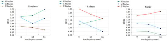 The change in EEG rhythm energy induced by the addition of each LFS relative to the original video signal under the three known mood conditions is shown in Figure 13. When comparing the results of EEG energy induced by various LFS signals added to the original video signals under three known emotion conditions (averaged across four electrode locations), it was found that the results of the θ and β rhythm energy induced by three LFS signals known to trigger happy emotions were consistent with the results in Table 3, but there was no apparent pattern among these three signals. However, when the known emotions were sadness and shock, the effects of LFS signals on EEG energy showed a consistent pattern. For the signals S4, S5, and S6, the strength of θ rhythm energy induced after adding them to video signals that clearly elicited sadness emotions was in the order of S6 > S5 > S4, while the relationship between the LFS signals and the increase in α and β rhythm values was opposite, i.e., S6 < S5 < S4. This indicates that the addition of LFS signals overall stimulates the energy of emotion-related brain functional areas in terms of EEG waves, but the effects of different LFS signals on different rhythm energies are different. In the observed EEG results of known shock, it was found that the signals S7, S8, and S9 showed a relatively consistent relationship with the three rhythm energies. Although they all suppressed θ rhythm energy, the suppression intensity was in the order of S7 > S8 > S9, and the activation effects on α rhythm were in the same order. Similarly, they all had an activating effect on β rhythm energy, but the degree of activation was in the opposite order, i.e., S7 < S8 < S9 (Table 6).