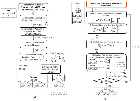 Subsequently, the boundary conditions were defined for the multidual matrices and , eliminating the real and dual imaginary DOF under homogeneous Dirichlet boundary conditions. Then, the information from each imaginary axis of the multidual arrays was extracted to form matrices corresponding to each of the dual imaginary axes of the tridual number. The matrices and constructed from the information of the real axis were used to solve the GEP and obtain the eigenvalues and eigenvectors. In addition, the information from the dual imaginary axes was used to calculate the partial derivatives of the system matrices by following Equation (7). Then, as described in Figure 2b, the eigenvalues , the eigenvectors for , the system matrices and , and their partial derivatives, were used to calculate the sensitivities of the eigenvalues and eigenvectors. Three iterations were processed through the algorithm in Stage 3.