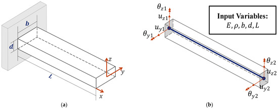 The second example corresponds to a numerical implementation of the methodology for obtaining sensitivities in eigenfrequency problems using HYPAD. In this section, the methodology is applied to the analysis of the free vibration of a uniform elastic cantilever beam, illustrated in Figure 4a. The beam has a length , stiffness , mass density , and a constant rectangular cross-sectional area with width , and height . The analytical expressions for the natural frequencies and shapes of the free vibration modes correspond to [76]: