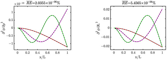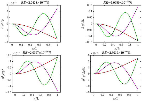 A cantilever beam was analyzed with properties and . The characteristics of the cross-section area yielded distinct eigenvalues. Higher-order sensitivities with respect to the material (, ) and geometrical () input design parameters were calculated. Three specific cases are presented, each representing an independent pass throughout the whole methodology. Third-order sensitivities with respect to the density , third-order sensitivities with respect to the length of the beam , and mixed third-order sensitivities with respect to the three parameters. This requires using tri-dual numbers with imaginary axes. In the first case, perturbations were added only to on its three independent dual imaginary axes, becoming . In the second case, perturbations were added only to on its three independent dual imaginary axes, becoming In the third case, the perturbations were added to the three variables, these becoming , and . The axes not displayed here contain a value of zero for all cases. Table 1 shows the results corresponding to the eigenvalues and Figure 5 the results for the eigenvectors. Excellent agreement is found between the analytical solution and the numerical estimates, resulting in a maximum RE of in the eigenvalues, and an average RE of for the eigenvectors.
