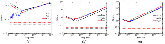 The relative percentage error (RE) described in Equation (34) was used to measure the error for each of the eigenvalues and their sensitivities. For the eigenvectors, an average of the RE was used as an error measurement. For both measures of error, the analytical solutions in Equations (29)–(30) were used as a reference.