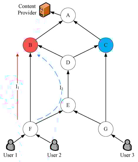 Scenario 1: Assume that, in Figure 1, User 1 and User 2 send two interest messages,  and , respectively, and request the content provider A to provide two linearly independent encoded blocks named  for encoded group 1 of content , with the name identifier as . Assuming that edge node F has PIT and CS,  and  will be aggregated in the pending interest table  of edge node F due to the same content name. According to the normal multi-identifier network forwarding process, only one interest message is sent to the provider A. The data will be distributed to Users 1 and 2 until they are returned.