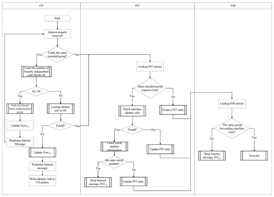 As shown in Figure 3, when the intermediate node  receives a data message response , it will first perform PIT matching based on the group name in the data message. If no interface is found through which an interest message requests the group, the intermediate node will discard the data message. Moreover, suppose that the coding vector carried by the data message is a linear combination of the coding vectors of the same coding group in the CS. In this case, the data message will be deleted, which can ensure that only linearly independent coding blocks are stored in the content store (CS). Otherwise, the content and encoding vector within the data message will be cached in the CS table. Then, the identity information of the originator of the interest message carried by the data message will be mapped to the Bloom filter of the content grouping entry.