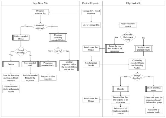 In a scenario wherein the content requester moves from one access point to another, as shown in Figure 4, the content requester  needs to communicate with the connected edge node  through a heartbeat packet to inform it of the connection status. When  receives the new, linearly independent coding vector  and coding block , to prevent the movement of , it will extract and send  and  to  to the cache. Suppose that  collects enough encoding vectors to decode the packet . In this case, it will perform a decoding operation, send the original content corresponding to the decoded  to , and delete the encoded blocks and vectors stored in  and .