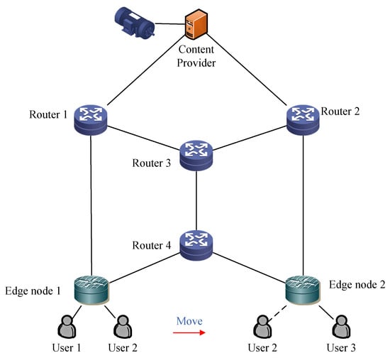 Network coding does not compress data; instead, it restores the original data by collecting sufficient encoded blocks for linear combination, which can facilitate the collaboration of multiple edge nodes. Two different edge nodes allow for redundant encoded packets. At the same time, if the original data are divided into K data blocks and encoded into M coded blocks (),  transmission errors can be allowed in network transmission. Such fault tolerance can alleviate the impact of data loss in network transmission during the movement of content requesters. On the other hand, during the movement process of the content requester, there may already be linearly independent coding blocks of the same content that have been cached in the different edge nodes that it is connected to, thereby reducing repeated content requests.