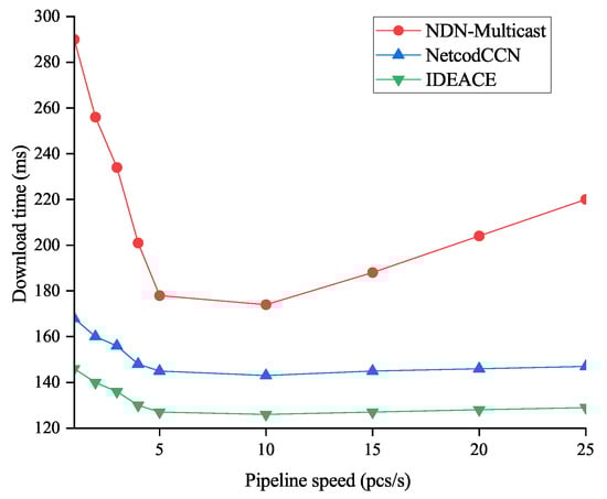 As shown in Figure 9, IDEANE achieved an average reduction in the download time of nearly 42% compared to NDN-Multicast and approximately 8.3% compared to NetCodCCN. IDEANE does not need to perform encoding and decoding operations on encoded blocks in the intermediate nodes. Instead, it directly forwards these packets.