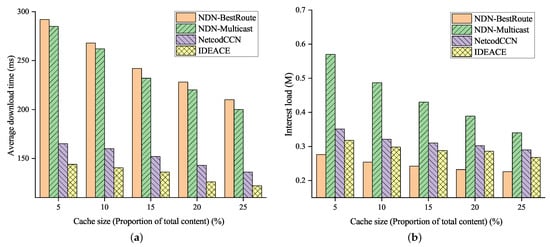 Figure 8a shows the impact of the cache size on the content download time and interest message load. The larger the cache, the more data blocks can be accommodated by intermediate nodes and the higher the probability of cache hits. Therefore, the download time of all forwarding strategies will be reduced. The three strategies using multipath forwarding can all achieve a shorter download time within 31.6% compared to NDN-BestRoute to achieve the desired content. IDEANE does not need to encode again at the intermediate nodes. It only makes use of the encoding vectors carried in the received encoded blocks to perform linear independent verification on the encoded blocks of the same encoded group. Thus, it can save 35.4% of download time compared to NetCodCCN.