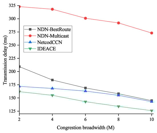 Figure 9 shows the influence of the bottleneck link network bandwidth on the content acquisition time. When other parameters remain the same, it demonstrates the influence of the bottleneck bandwidth on the transmission delay. It can be seen that NDN-BestRoute is most affected by the bandwidth. NDN-BestRoute does not choose the path in the middle of the butterfly network (router 3 to router 2) for requests from two edge nodes. The exact path will return all interest message requests to the edge nodes. The optimal path will be congested if the network bandwidth is too small. With the increase in bandwidth, this congestion situation will be resolved. When NDN-Multicast is adopted for multipath forwarding, each intermediate node will forward each interest message through two paths. The content provider needs to respond to the content request separately on each forwarding path, leading to request latency and transmission redundancy.
