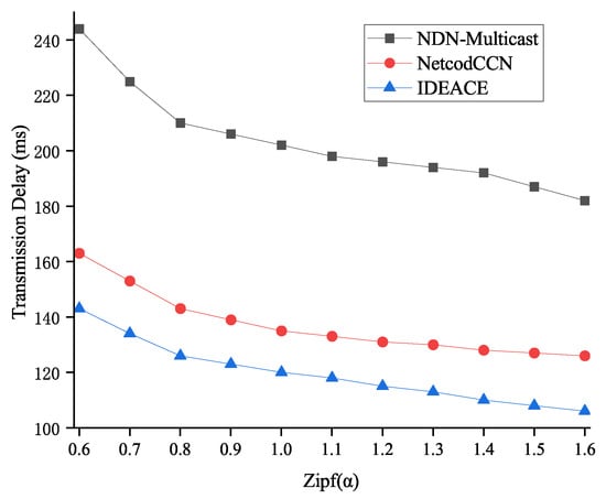 The influence of data popularity Zipf() on transmission performance is shown in Figure 10. The skewness of data requests is in the range of 0.6 to 1.2 following Zipf’s distribution. With the increase in , more popular content will be cached in more intermediate network nodes; the cache hit rate will also increase, while the download time will be reduced. The two network coding schemes achieve a higher cache hit rate than others. Both of them can support content requests from multiple content providers and aggregate the encoded blocks of the same content to reduce the amount of data transmitted by the network. Compared with NDN-Multicast, they can reduce the download time by approximately 41.6%. At the same time, IDEANE’s value is roughly 10.8% lower than that of NetCodCCN.