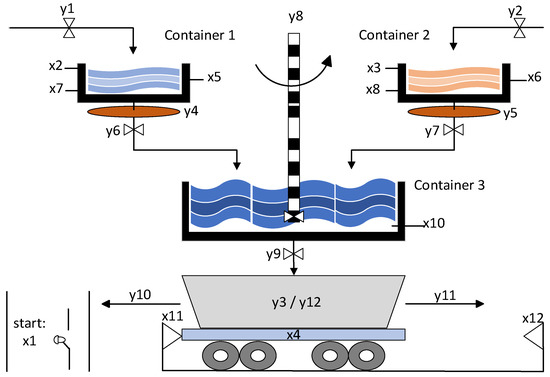 At that point, the liquid in two containers is warmed up (y4 and y5, respectively) and a cup is being loaded on the trolley (y3). The charged cart (x4) moves to the left edge (y10) until it reaches the leftmost position (x11), and the liquid in containers is warmed until it reaches the required temperature (x5 and x6). The output valves of the two containers are opened (y6 and y7), and the ready ingredients from both containers are mixed (y8) in the main (third) container. When both upper containers (the first and second one) are empty (x7 and x8), the beverage is ready for distribution (x9). Then, the output valve of the main container opens (y9), and the liquid is poured into the cup on the trolley. Once the main container is empty (x10) and thus the cup is full, the trolley moves to the right (y11), and after it reaches the appropriate position (x12), the cup is removed from the trolley, and the system returns to its initial state.