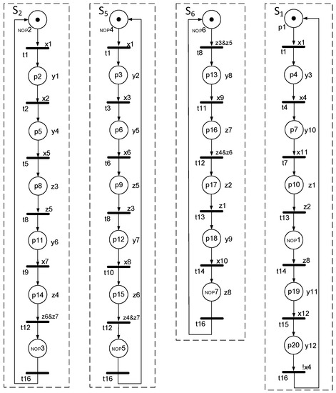 Since the above SMCs cover all places of the Petri net, the designer manually selects the most suitable components and checks, whether obtained solution fulfils the needs. In the presented example, four SMCs are selected as a final result: , while the redundant three , are reduced from the final solution. At the subsequent step, all places that occur in more than one SMC are manually replaced NOPs. This operation simply substitutes places that belong to multiple components by no-operational ones in order to avoid doubled actions performed by the decomposed controller. In the discussed example, the following result is obtained after this operation:
