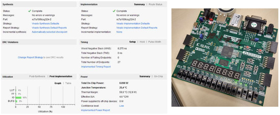 Finally, the functionality of the system was tested within the physical FPGA. The validation was performed with the use of switches and LEDs available on the Nexys 4 DDR prototyping board (Figure 5 right). In particular, input signals were assigned to switches, while output signals were connected with diodes to visualise the operation of the real-life system in an accessible way.