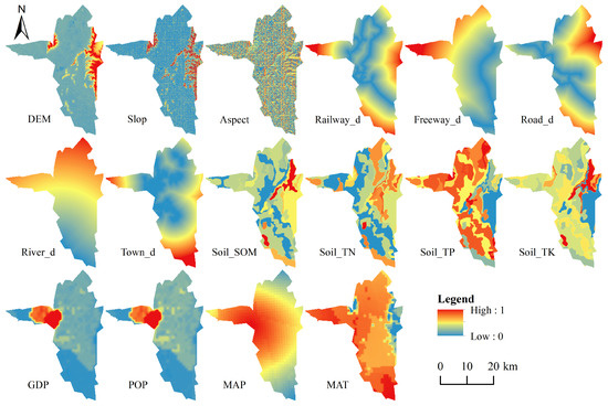 The sources and related descriptions of the study data are presented in Table 1, where natural environmental data and socioeconomic data were used as driving factors for the LU simulation: (1) LU data of Huaibei City for 1985, 1995, 2005, 2015, and 2020. The 2015 LU data were obtained from Landsat8 OLI image interpretation of Geospatial Data Cloud (http://www.gscloud.cn, accessed on 27 June 2022). Based on the LU classification of the Chinese Academy of Sciences, LU data were classified into five major classes: farmland, forestland, grassland, water, and construction land. (2) The 16 driving factors that can work on LUC were chosen in this study based on the selection principles [17]. These include the digital elevation model (DEM), aspect, slope, distance from the railroad (Railway_d), distance from the freeway (Freeway_d), distance from the roads (Road_d), distance from the rivers (River_d), distance from towns (Town_d), soil organic matter (Soil_SOM), total nitrogen (Soil_TN), total phosphorus (Soil_TP), total potassium (Soil_TK), gross domestic product (GDP), population density (POP), mean annual temperature (MAT), and mean annual precipitation (MAP). Figure 2 shows the driving factors after the normalization process. (3) Soil data were obtained from the soil sample datasets obtained from the 2010–2011 soil surveys, including soil organic matter, total nitrogen, total phosphorus, and total potassium data. The sample points are linked to the vector map according to the same soil type and transformed into a raster. (4) The slope and aspect data were extracted from DEM in ArcGIS. (5) Spatial distance driving factor maps from railroads, freeways, roads, rivers, and towns were gained from vector data acquired from Open Street Map by performing Euclidean distance analysis in ArcGIS.