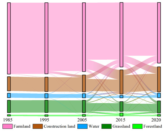 Calculation of the integrated LU dynamics for the four time periods from 1985 to 2020 revealed that it was 0.04% from 1985 to 1995, 2.21% from 1995 to 2005, 18.51% from 2005 to 2015, and 34.62% from 2015 to 2020. LUCs in the region were faster after 2005, which may be related to rapid socioeconomic development and accelerated urban transformation. Figure 3 shows the Sankey diagram produced by the LU transfer matrix of the study area from 1985 to 2020, indicating the transfer in and out of each LU type in different periods. From the figure: (1) From 2005 to 2015, transfers in and out between LU types were more frequent. Farmland was largely reduced and 82% of the transferred out area was transferred into construction land. The water area decreased by 12.06 km2 and the largest area was transferred to farmland and construction land. Overall, the area of construction land increased by 51.45 km2 in this period, of which 67.45 km2 of farmland was transferred to construction land, 4.19 times more than the previous time. (2) From 2015 to 2020, there are different degrees of area transfer between each LU type; the change is 164.29 km2 and the farmland continues to decrease by 27.35 km2. Additionally, the water area increased by 15.10 km2, mainly from farmland and construction land. The construction land increased by 5.88 km2 and the growth was mainly from grassland, which was transferred into 6.06 km2. In a comprehensive view of the four time periods, the area of farmland has been decreasing and the ratio of the area transferred into construction land to the total area transferred out from farmland was 86%, 83%, 82%, and 60%. The areas of other LU types transferred into water in the four time periods were 0.30 km2, 2.51 km2, 6.66 km2, and 21.50 km2, in order.