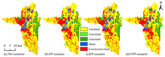 - Among the four scenarios, the area of construction land decreases with the increase in the area of farmland and forestland under scenario FEP. This shows that curbing the over-expansion of construction land and controlling the total areas of construction land is conducive to the protection of farmland and forestland, and safeguarding food security and ecological safety. Urban sustainability is stronger compared to scenario NG.