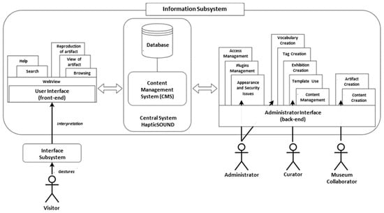 The purpose of the Information Subsystem is to inform museum visitors about the traditional Cretan musical instruments. Specifically, it allows the user to display text, videos, and 3D representations of traditional musical instruments on the screen (i.e., lute and oud), navigate collections and digital exhibitions, and listen to samples of traditional musical instruments. The architecture of the Information Subsystem is presented in