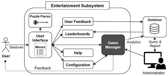 The purpose of the Entertainment Subsystem is to engage visitors in creative activities while they are entertained. To achieve this, the Entertainment Subsystem includes engaging game mechanics (such as puzzles) and gamification elements (such as leaderboards). Specifically, the Entertainment Subsystem is a digital 3D gesture-based serious puzzle game, which employs the Leap Motion controller to receive gestural input from the user. The visitor virtually assembles the traditional Cretan lute that is disassembled into its component parts. Therefore, to solve the puzzle, the visitor has to identify the lute’s parts, reflect on the lute’s structural model, and interact with the virtual representations of the lute’s parts to gain an in-depth understanding of its structure and functionality. Nevertheless, the Entertainment Subsystem aims to foster positive feelings in the users by engaging them in an amusing and productive activity, performed in a realistic and attractive 3D environment. The architecture of the Entertainment Subsystem is presented in