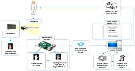 Figure 7), while cameras detect his/her gestures through algorithms, which are processed by the Raspberry Pi Subsystem. Then, these data are sent to the central system of HapticSOUND via Wi-Fi in order for the performed gesture to be recognized. To achieve this, the system was trained beforehand with expert gestures by applying machine learning algorithms and then these gestures were mapped to sounds that have been stored in the HapticSOUND database. As a result, the user executes a gesture and the system recognizes the performed gesture and simultaneously produces sounds. Apart from the audio feedback, the system also provides visual feedback to the user.