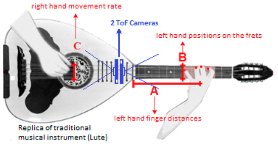 Section 3.3, two ToF cameras are used to capture the user’s gestures. Camera 1 records and monitors the distance of the instrumentalist’s left hand touching the keyboard (we consider the performer to be right-handed), while camera 2 records the tempo given by the instrumentalist with his/her right hand (