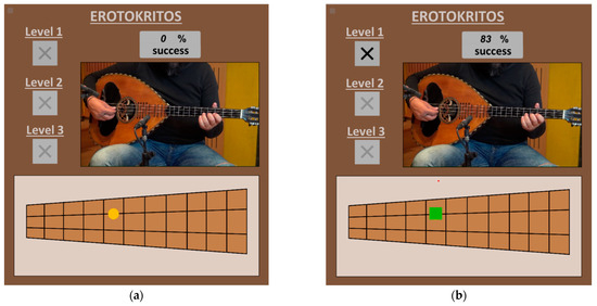 Then, the user moved on to Phase 2 (Case 2), where s/he performed on the TMI replica three music excerpts of a famous Cretan traditional song named “Erotokritos”. The three music excerpts corresponded to the three levels of sensorimotor learning that were of increasing difficulty. The user moved to the next excerpt only if s/he passed the score of 60% in the previous level. An annotated fretboard was displayed to him/her, which s/he had to follow by imitating the gesture of the expert music teacher in order to produce the proper music sound. The duration of Phase 2 ranged from approximately 2 to 5 min depending on the pace and the success level of each user.
