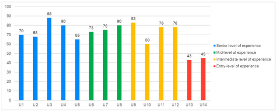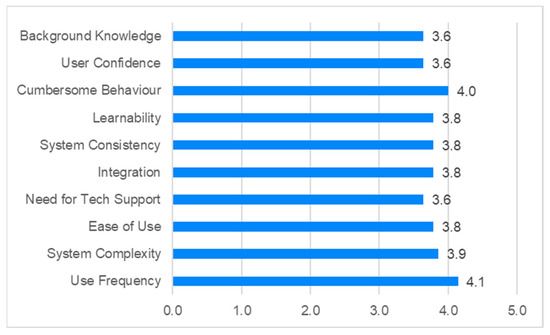 Figure 12, the positive meaning of each question was taken into account, and a number close to 5 indicates user satisfaction. Through the analysis of users’ responses to each question, the most important usability weaknesses are related to “Background Knowledge”, “User Confidence”, and “Need for Tech Support”.