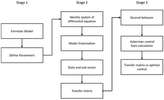 In the second stage, to define a system of differential equations from an SD simulation model represented by the Forrester diagram, one must first identify the variables involved in the system and how they relate to each other to form a whole. Then, the linearization of the state variables must be performed. To linearize the system, all the system variables can be expressed as a linear combination of the state variables. By relating state variables and their derivatives, they are replaced in the system of differential equations.