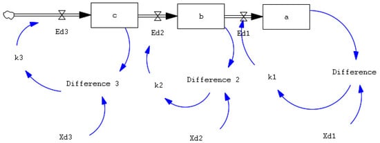 Figure 2 shows a Forrester diagram representing the three processes in the textile sector. The diagram is divided into three horizontal blocks, each of which represents a different process: “Knitting = a“, “Basting = b” and “Ironing = c”. At the top of each block is a box indicating the process name.
