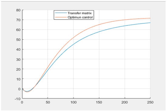 Figure 5 shows a comparison between the transfer-matrix response and the optimal Ackermann control for a staggered input with an amplitude of 72. The transfer-matrix response is represented by the curve in blue, while the optimal Ackermann control response is represented by the curve in red. The graph shows that the optimal Ackermann control response is faster and has fewer oscillations than the transfer-matrix response. This is because the optimal Ackermann control uses complete system information to calculate the control action, while the transfer matrix only takes into account input and output information.