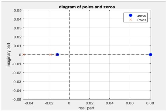 The pole and zero diagram of a transfer function is a useful tool for analyzing and understanding the behavior of a control system. It allows visualization of the location of the poles and zeros in the complex plane, which provides important information about the stability and response of the system. Figure 6 shows the diagram of poles and zeros in the imaginary and the real plane of the transfer function. The following poles and zeros were identified. See Equations (45) and (46).